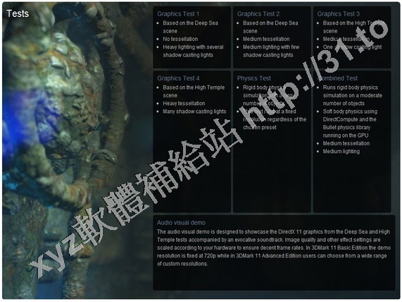 圖形測試場景、物理測試場景、綜合測試場景、音頻視覺演示(解析度固定於720p)。可